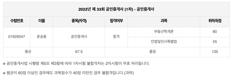 참고로 공인중개사 시험은 평균 60점 이상 합격, 과락 40점이기 때문에, 부동산학개론에서 80점, 민법에서 40점 받으면 합격이다.